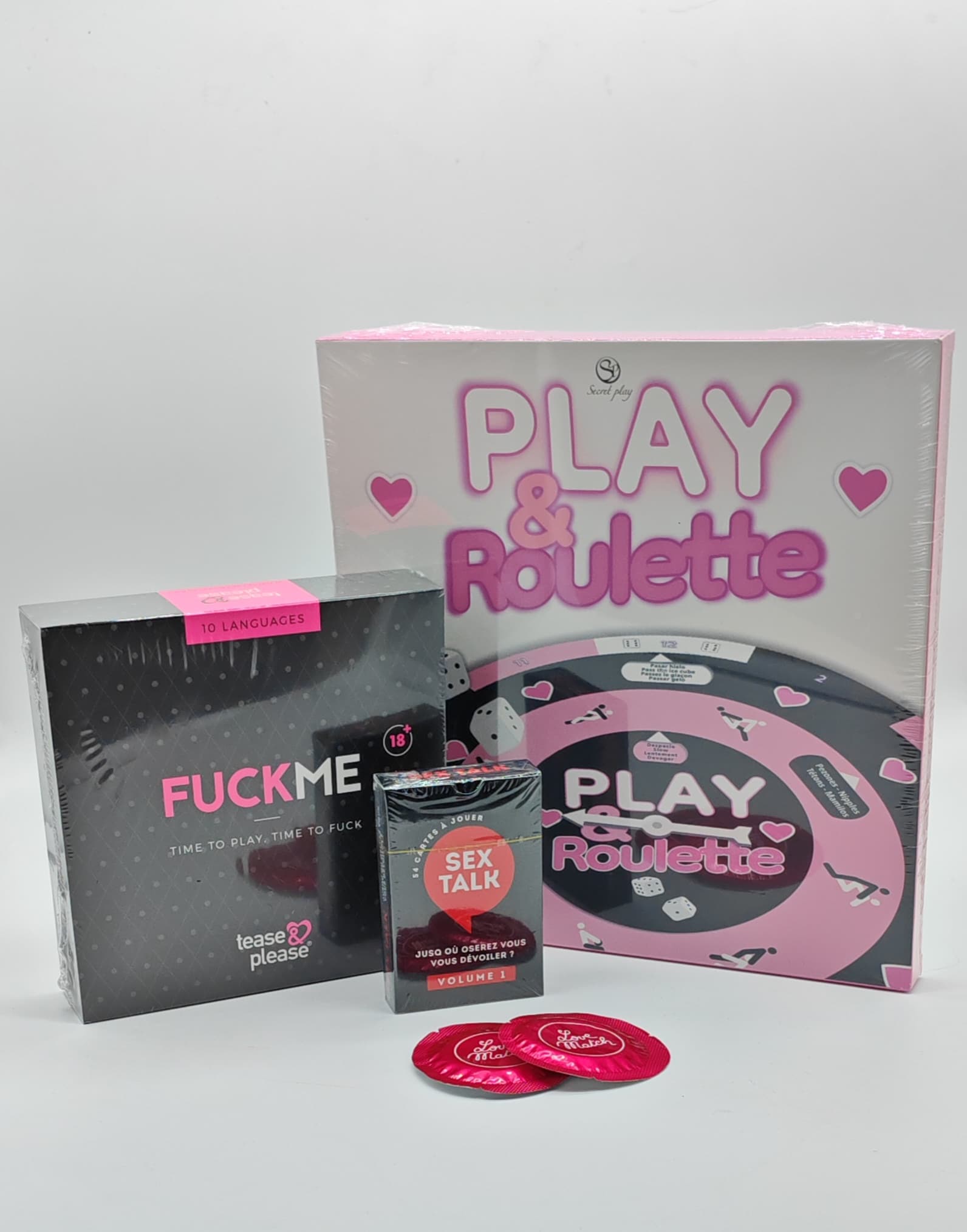 Jeu de roulette, 1 jeu de 52 cartes Kama sutra, 1 love ring, 1 love ring vibrant, 2 dès coquins et un jeu de questions.